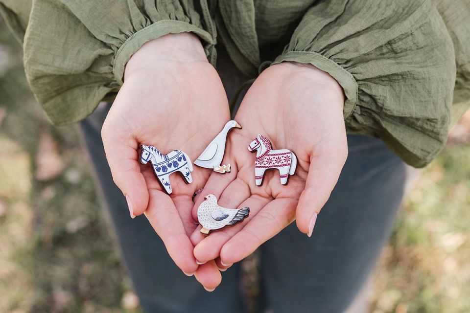 The traditional wooden Folk Horse brooch is inspired by folk motifs and brings a piece of cultural heritage to any outfit.